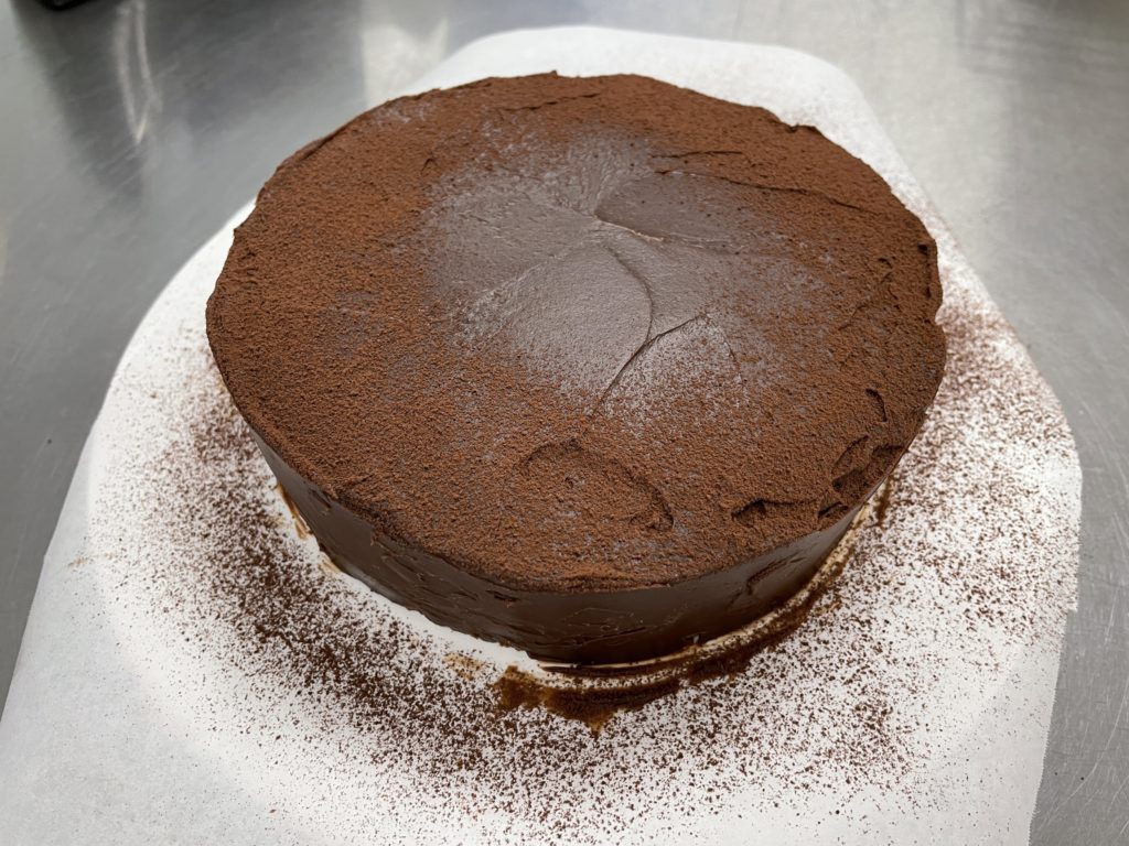 チョコレートガナッシュを塗って、ココアパウダーをふりかけて完成です。